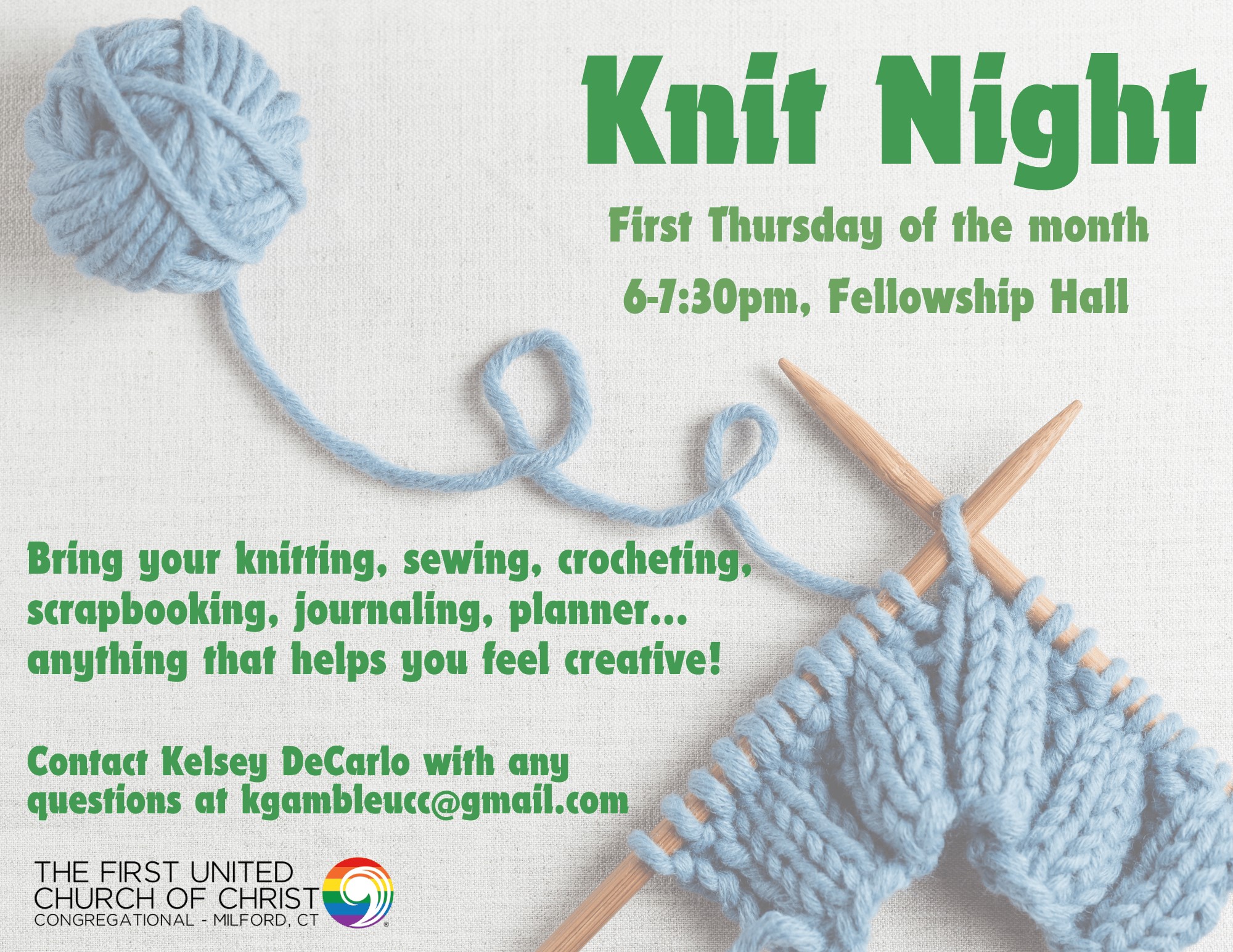 May 7 Featured 6:00 pm - 7:30 pm Knit Night at First United Church, Milford Fellowship Hall 34 West Main St, Milford Event Details Get Directions