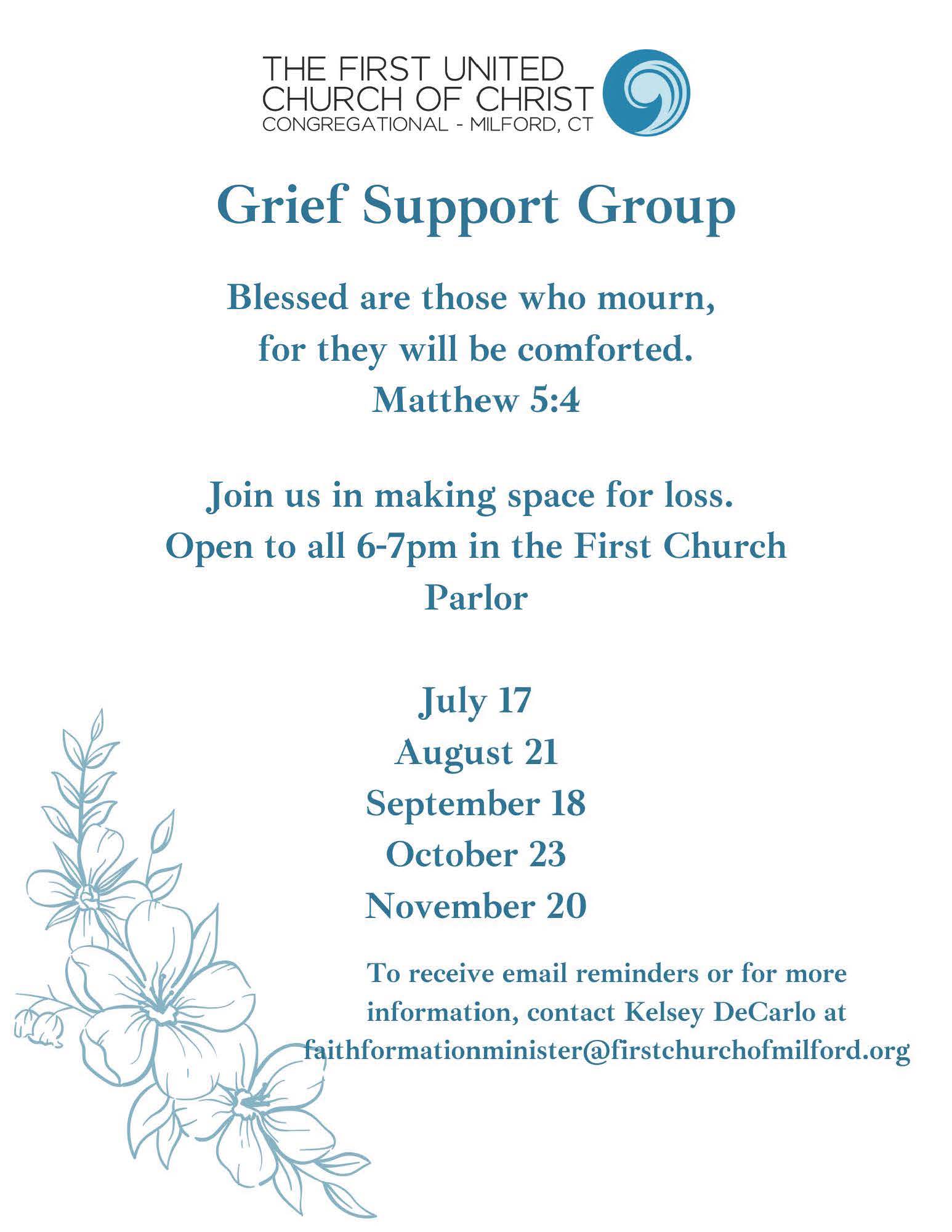 Featured October 23 @ 6:00 pm - 7:00 pm Grief Support Group Grief Support Group Church Parlor 34 West Main St, Milford, CT, United States